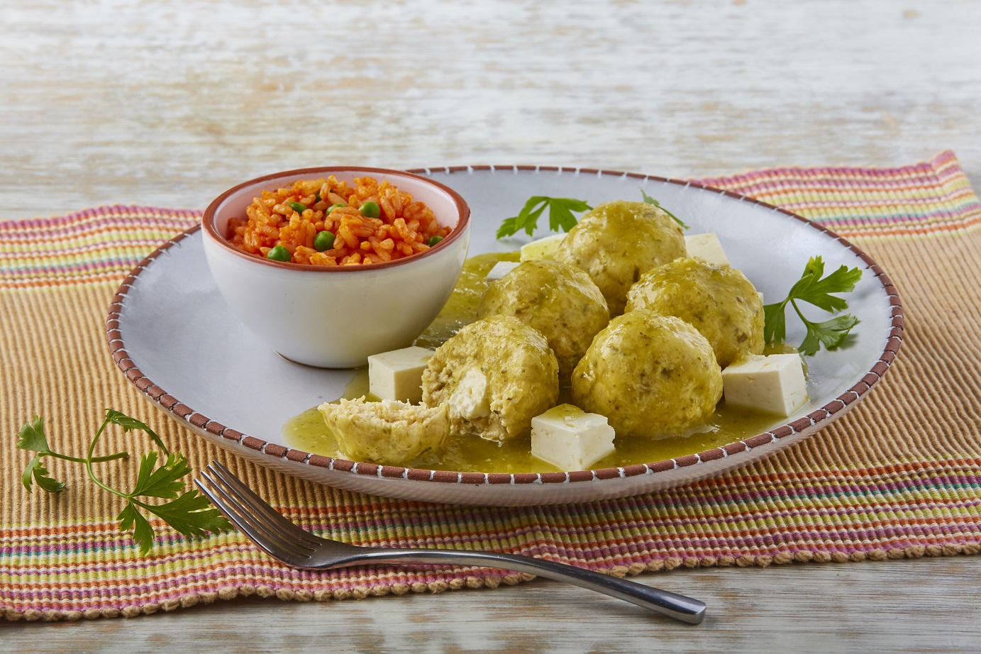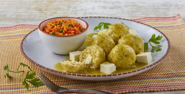 Albóndigas de pollo rellenas de queso panela en salsa verde