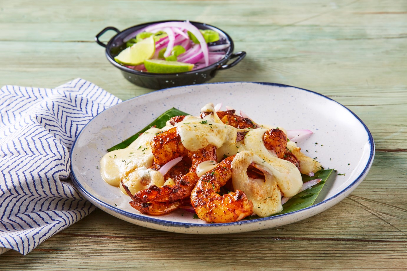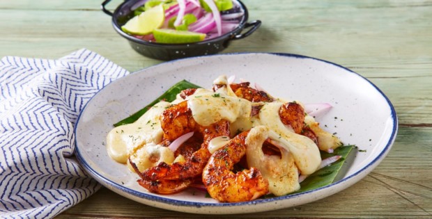 Camarones al pibil gratinados con queso tipo manchego
