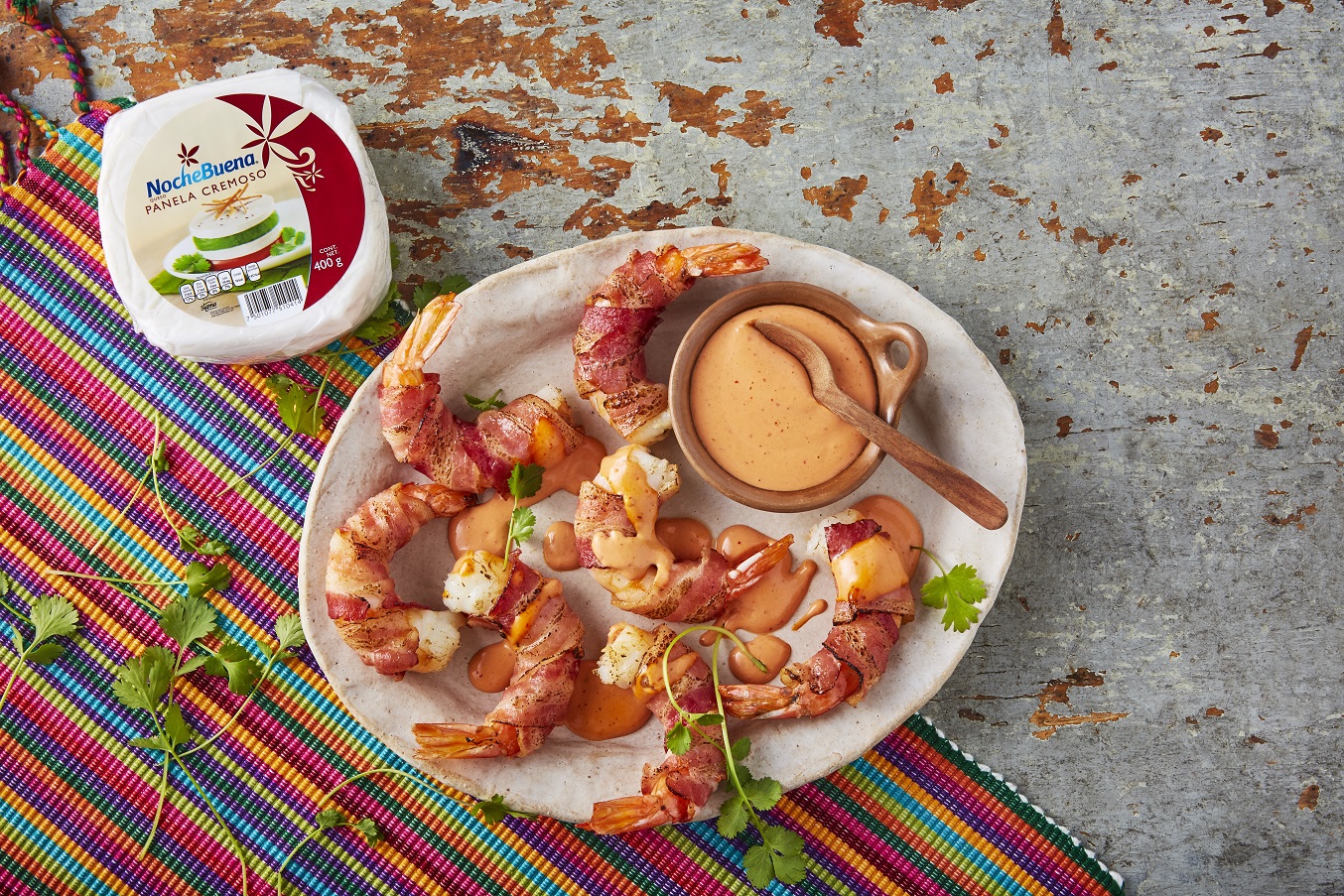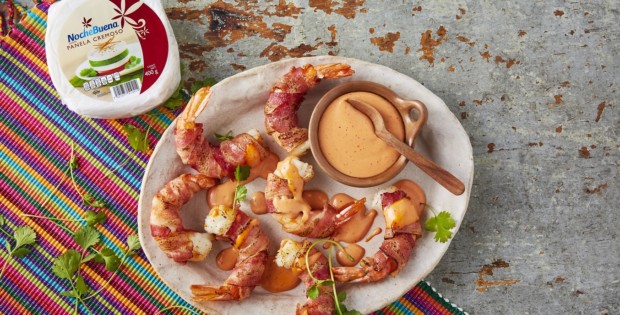 Camarones envueltos en tocino con dip de chipotle y queso – Nayarit