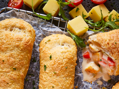- Barniza los chicken bakes con huevo batido, espolvoréalos con queso Gouda rallado y mételos al horno durante 20 minutos a 180 grados.