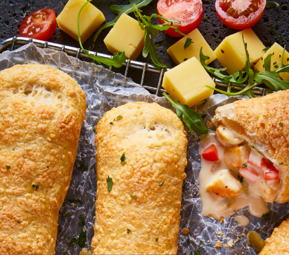 - En cuadros grandes de masa de hojaldre sirve una cucharada de la mezcla, agrega cubos de queso Gouda, envuelve y cierra con huevo.