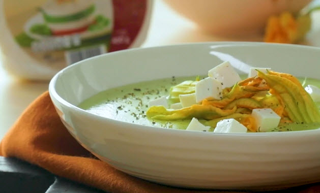 - Sirve y decora con flores de calabaza y más cubos de queso Panela Cremoso.