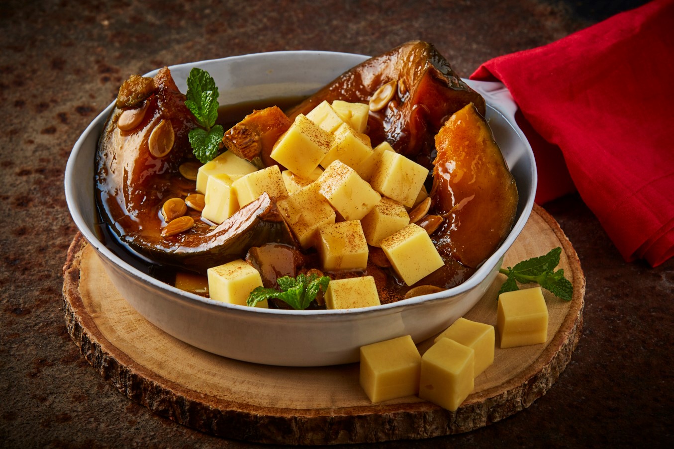 - Sírvela caliente en un plato con cubos de queso Gouda y hojitas de menta o hierbabuena.