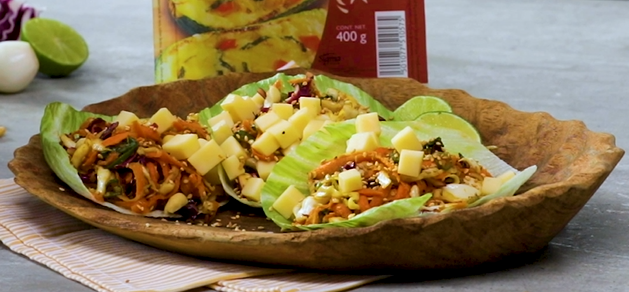 - Después cuando el aderezo esté listo integra la col, la cebolla y la zanahoria. Sirve sobre una hoja de lechuga y agrega cubitos de queso tipo Manchego.