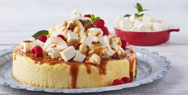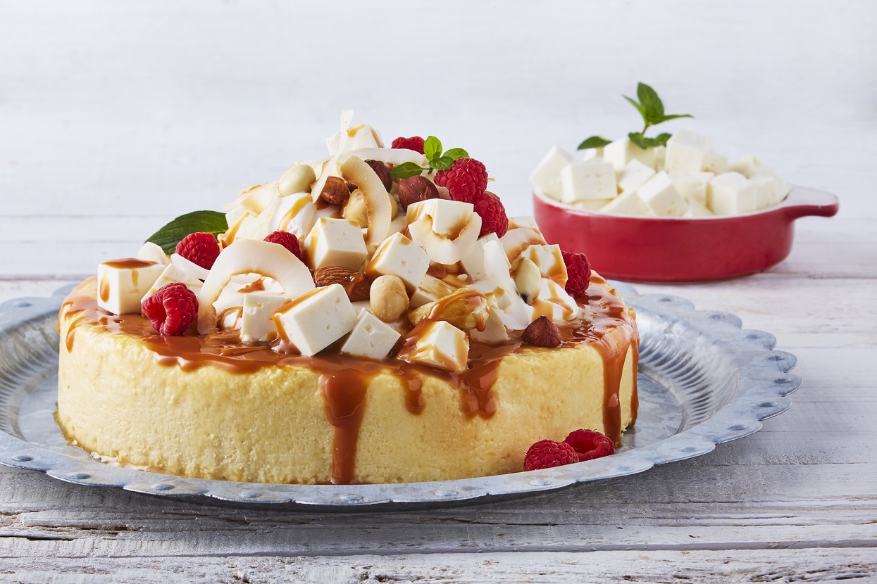 - Para decorar, derrite el azúcar en un sartén y vierte el caramelo encima, agrega cubos de Queso Panela Cremoso y frutos rojos.