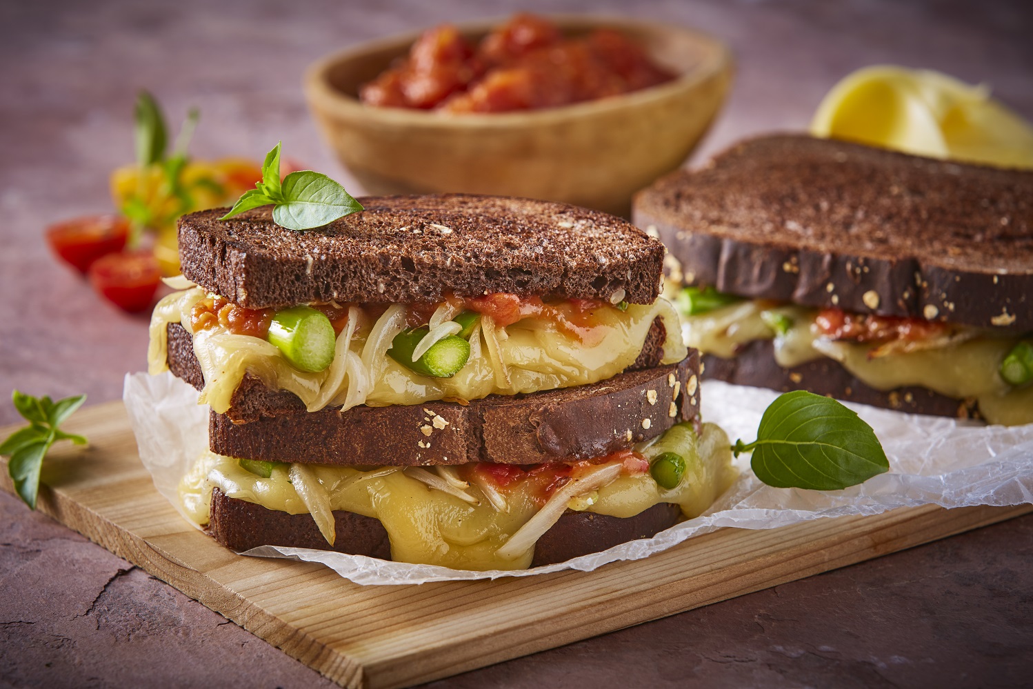 - En otro sartén o plancha calienta dos rebanadas de pan con dos o tres rebanadas de queso tipo Manchego NocheBuena hasta que se derrita, agrega la mezcla de verduras y agrega tantos pisos de pan como quieras.