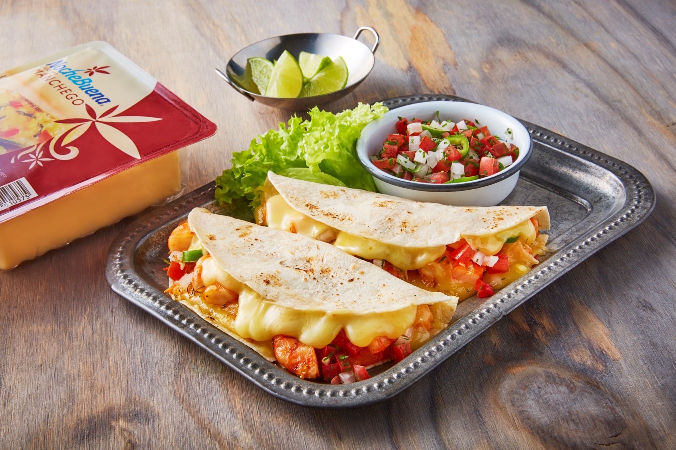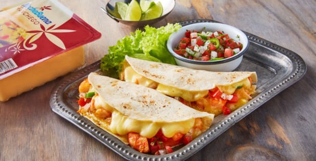 - En una plancha pon los camarones, y las tortillas de harina con una rebanada de queso tipo Manchego, cuando se funda agrega los camarones, saca del fuego y sirve con pico de gallo.
