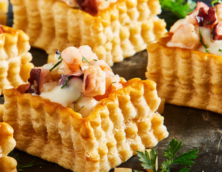 Volován de mariscos gratinados con queso tipo manchego extramadurado ahumado