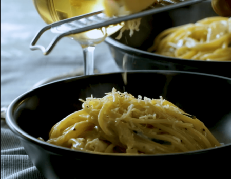 Pasta con salsa de queso y arándano