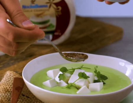 Sopa fría de aguacate con aceite de chile y queso panela cremoso