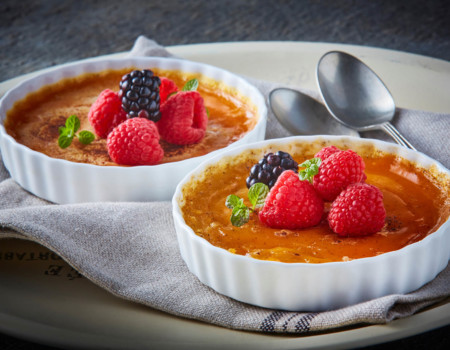 Crème Brûlée con queso tipo Manchego extramadurado con arándanos