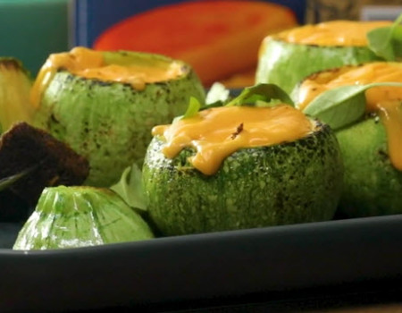 Calabacitas redondas rellenas de fondue con queso port salut