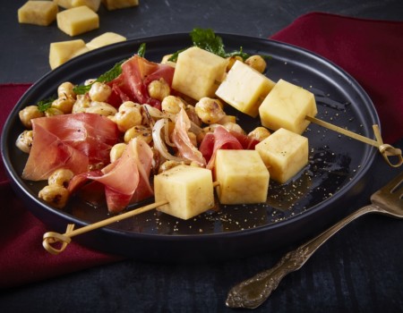 Brochetas de Queso tipo Manchego y ensalada de garbanzo