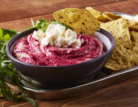 Hummus de betabel con Queso Panela y pico de gallo