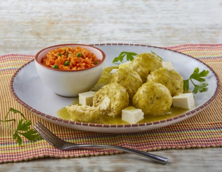 Albóndigas de pollo rellenas de queso panela en salsa verde