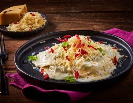 Ravioles de espinacas queso tipo Manchego extramadurado con Arándanos