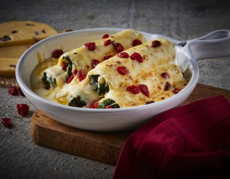 Canelones en salsa de queso tipo manchego extramadurado con arándanos
