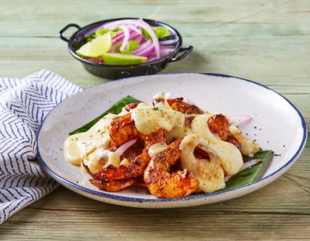 Camarones al pibil gratinados con queso tipo manchego