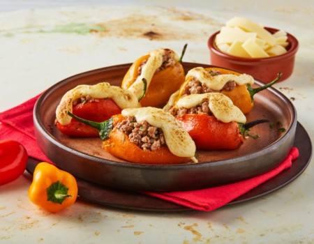 Pimientos rellenos de carne con queso tipo manchego
